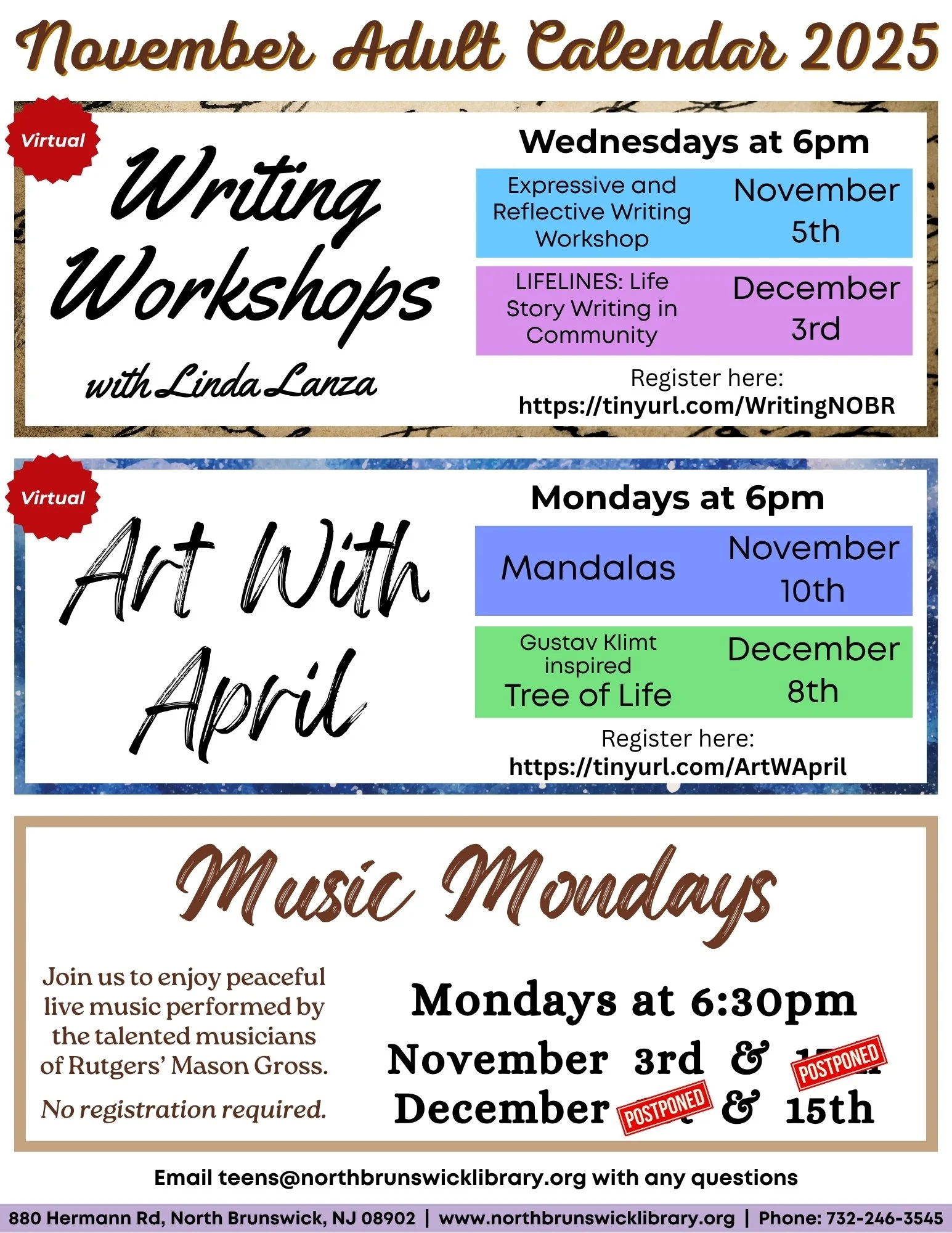 Nov 5 6:00 PM18:00 Adult Programs Writing Workshops with Linda Lanza Wednesday, November 5, 2025 6:00 PM 7:30 PM 18:00 19:30 North Brunswick Public Library (map) Google Calendar ICS View Event →