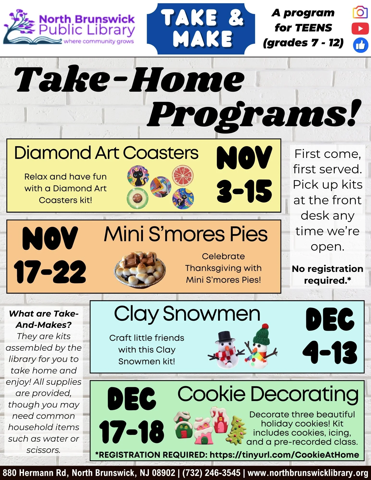 Nov 1 to Dec 18 Teen Programs Teen Take-Home Programs Sat, Nov 1, 2025 9:00 AM 09:00 Thu, Dec 18, 2025 8:00 PM 20:00 North Brunswick Public Library (map) Google Calendar ICS View Event →
