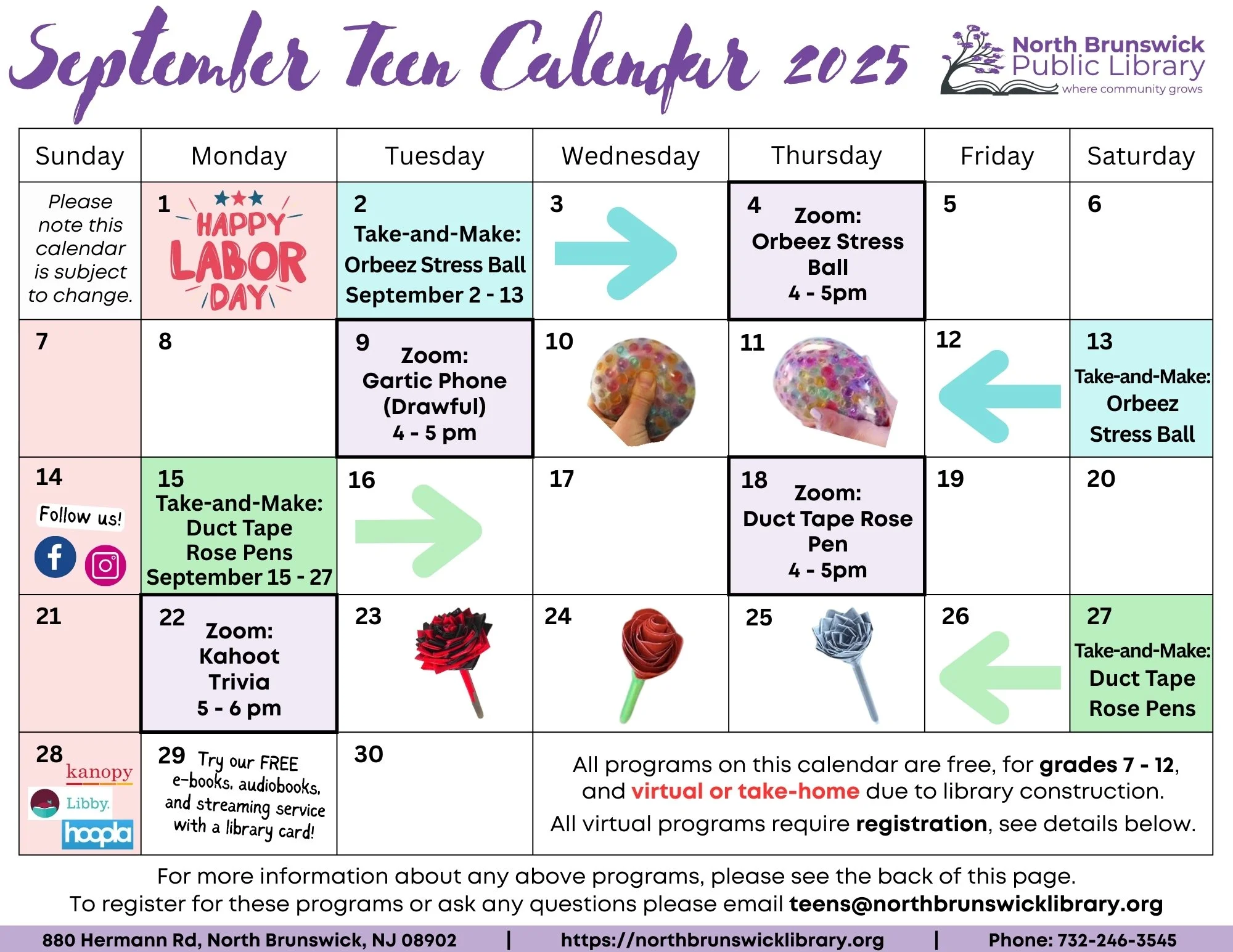 Sep 2 to Sep 30 Teen Programs September Teen Calendar 2025 Tue, Sep 2, 2025 9:00 AM 09:00 Tue, Sep 30, 2025 5:00 PM 17:00 North Brunswick Public Library (map) Google Calendar ICS View Event →