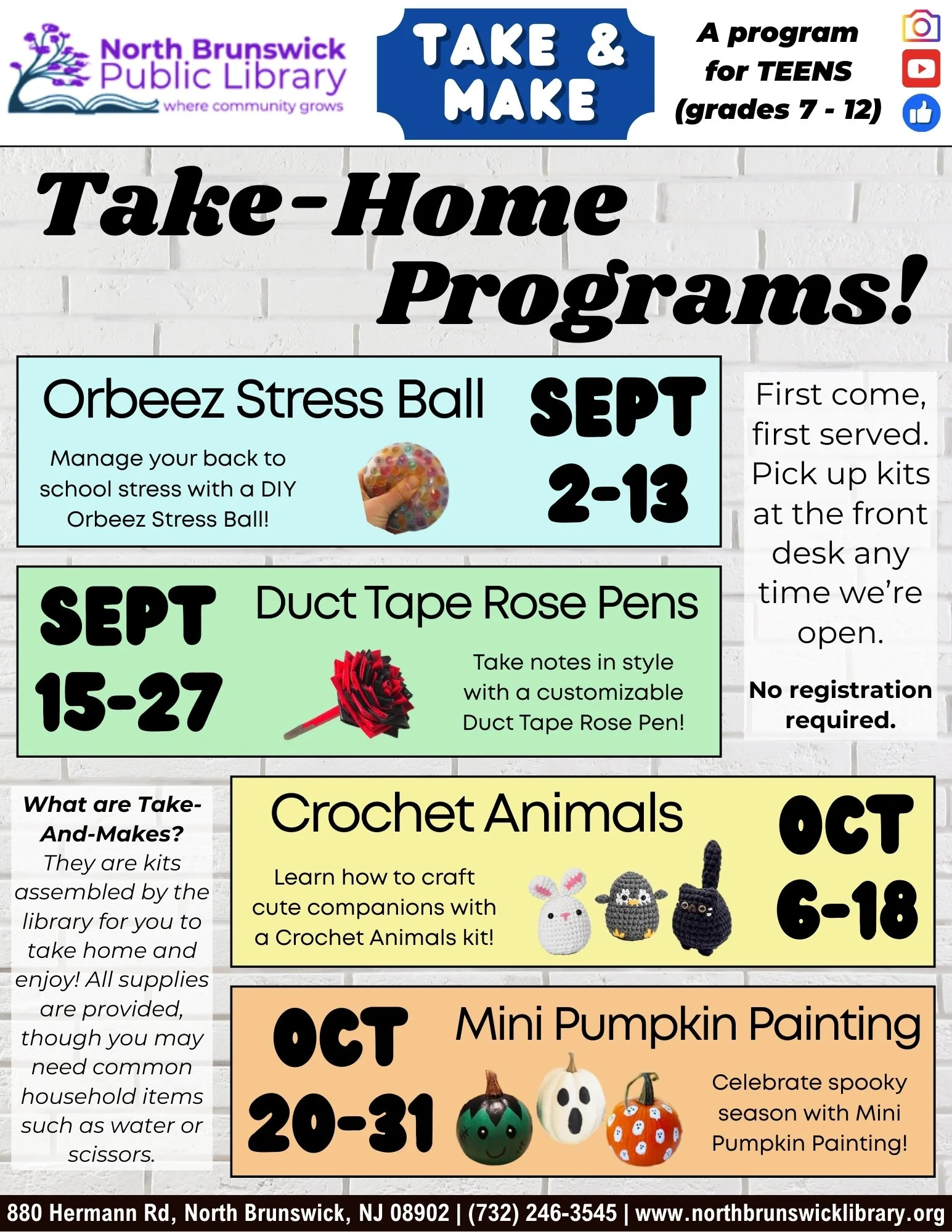 Sep 1 to Oct 31 Teen Programs Teen Take-Home Programs Mon, Sep 1, 2025 9:00 AM 09:00 Fri, Oct 31, 2025 7:00 PM 19:00 North Brunswick Public Library (map) Google Calendar ICS View Event →