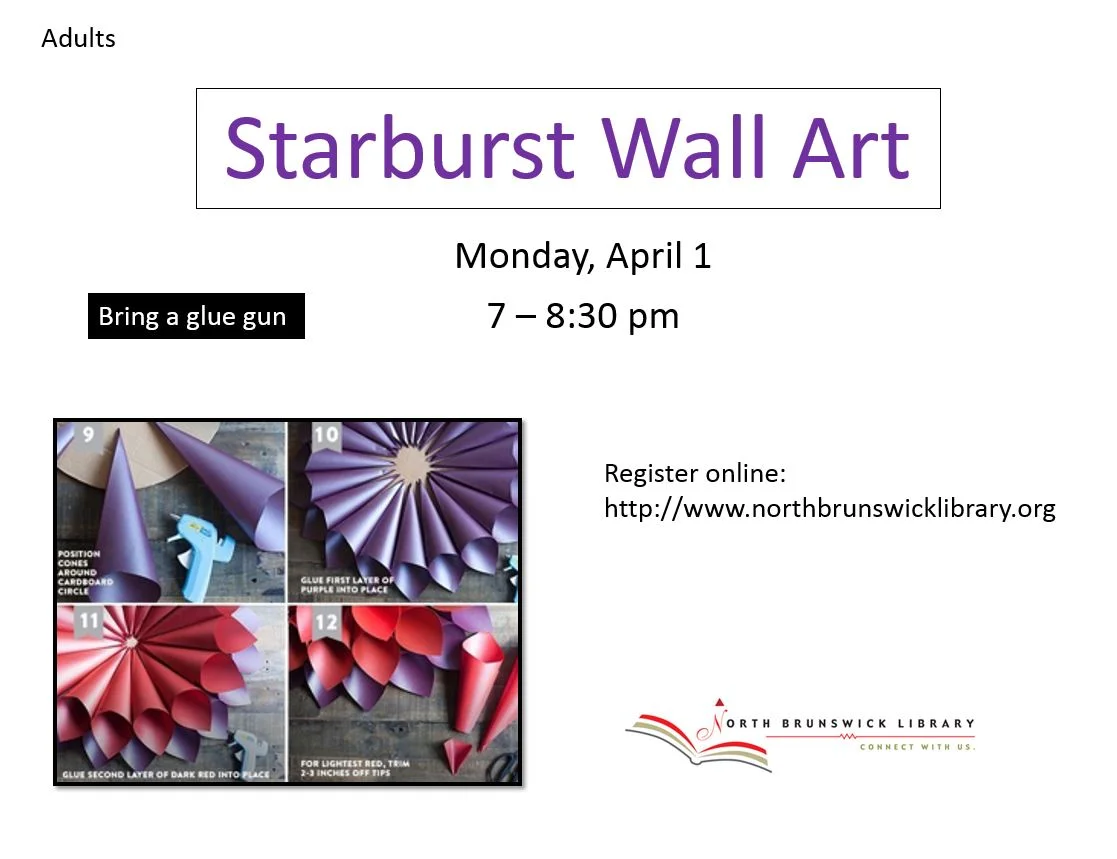 Starburst Wall Art Class on Monday, April 1 from 7 - 8:30 pm. Register online: https://forms.gle/9fEqKKzwJfSPGyHR8
