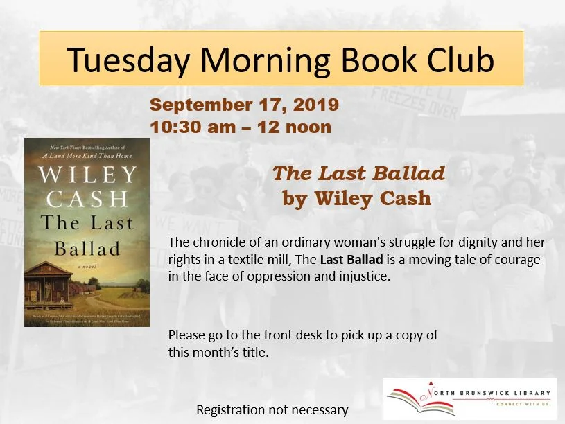 Book Club: The Last Ballad by Wiley Cash on Tuesday, September 17 from 10:30 am - 12 pm. Copies of the book are at the front desk. Registration not necessary.