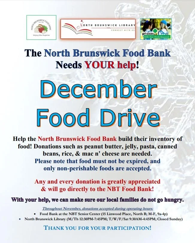 Throughout December, we're teaming up with Girl Scouts of New/North Brunswick & providing a space for your donations to help North Brunswick Food Bank build their inventory of food!