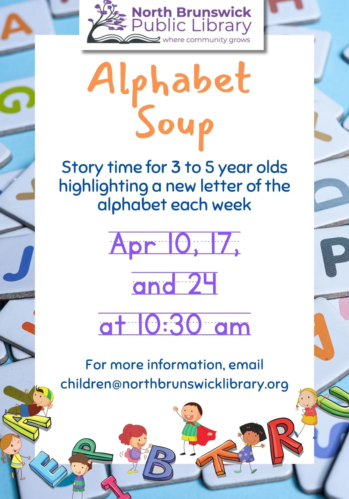 Alphabet Soup Wednesday, April 10, 2024 10:30 AM 11:00 AM 10:30 11:00 North Brunswick Public Library 880 Hermann Rd North Brunswick, NJ 08902 (map) Google Calendar ICS