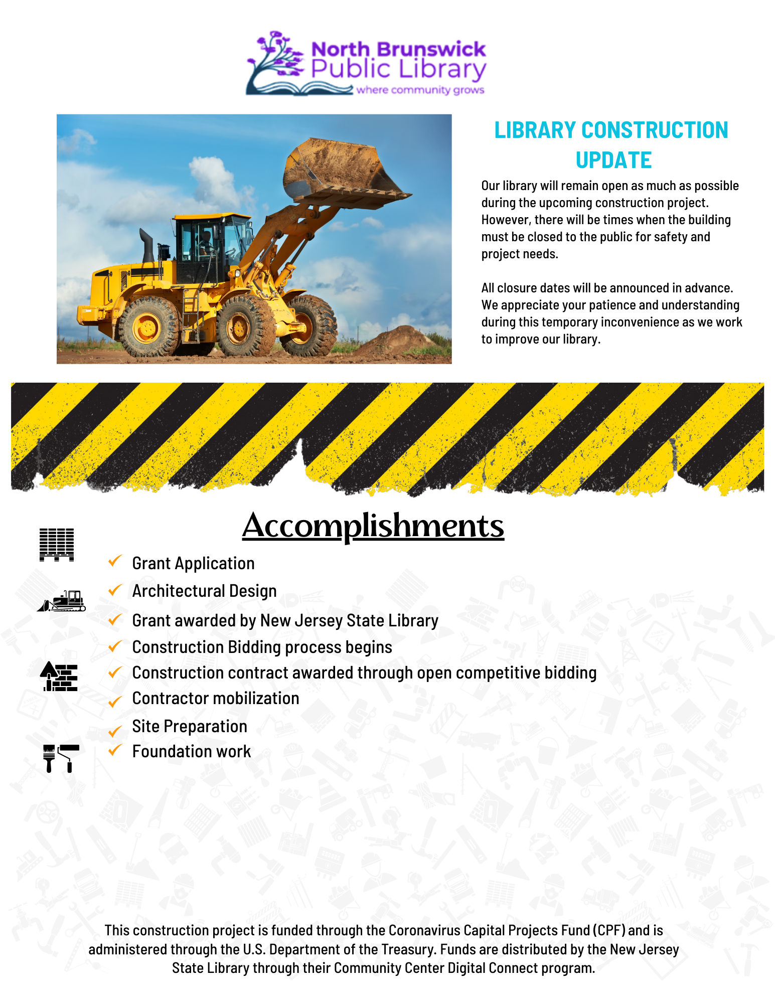 This construction project is funded through the Coronavirus Capital Projects Fund (CPF) and is administered through the U.S. Department of the Treasury. Funds are distributed by the New Jersey State Library through their Community Center Digital Connect program.
